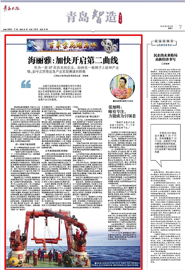 提起青島海麗雅集團,可能不少人還很陌生。但若說起應(yīng)用它生產(chǎn)的特種繩纜的國家載人潛水器“蛟龍?zhí)枴薄⒑Q罂瓶即翱茖W(xué)號”、大型飛船返回艙、萬米深淵級科考等國家重大科研項目,可就人盡皆知了。