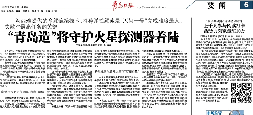 按照計劃,“天問一號”將于明年2月到達火星并開展著陸準備等工作。屆時,“青島造”的特種繩索將接受“實戰測試”。