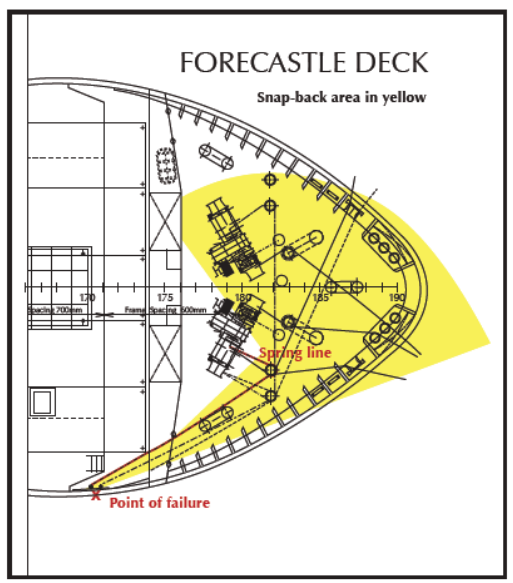 特定的系泊布置使得反彈區域難以預測,從斷裂點回彈的距離越遠,影響到的急速回彈區域寬度將會越大。通過導向滾輪牽引的纜繩在彈回系纜點過程中,將會沿著弧線軌跡運動,也將導致反彈區域擴大。
