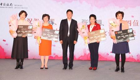 活動(dòng)現(xiàn)場(chǎng),中國(guó)銀行青島支行紀(jì)委書(shū)記兼工會(huì)工委主任付連曄向獲得2016年度中國(guó)杰出創(chuàng)業(yè)女性稱號(hào)的張旭明、董輝、楊麗、邢慧四位優(yōu)秀的女企業(yè)家贈(zèng)送中國(guó)銀行無(wú)限卡表示祝賀。