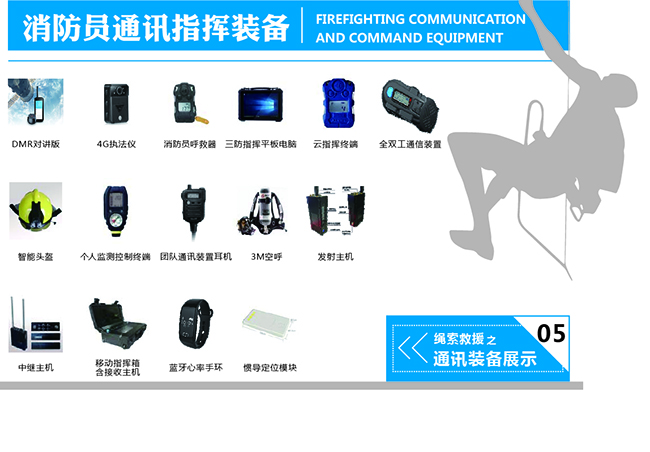 消防員通訊指揮裝備:DMR對講版,4G執(zhí)法儀,消防員呼救器,三防指揮平板電腦,云指揮終端,全雙工通信裝置,智能頭盔,個人監(jiān)測控制終端,團(tuán)隊通訊裝置耳機(jī),3M空呼,發(fā)射主機(jī),中繼主機(jī),移動指揮箱含接收主機(jī),藍(lán)牙心率手環(huán),慣導(dǎo)定位模塊。