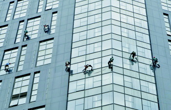 近年來,城市的高樓越來越多,大家的清潔意識和環(huán)保意識不斷增強,高空清洗這門服務(wù)也更有市場?!俺擞暄?、有風(fēng)等惡劣天氣,基本上工人們都有活干,"五一"和"十一"之前是清潔的高峰期。有時因為樓層很高,清洗一趟要好幾個小時,清潔工又不能中途下來,只能把飯帶在身上,餓的時候就懸在空中把飯吃了。”濟南楚潤清洗公司副總經(jīng)理尹建利介紹。