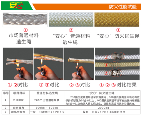 “安心”牌防火逃生繩230℃高溫條件下可長期使用,560℃條件下可有效使用10分鐘,破斷力達2000kg,火災現場能夠確保一家三口進行有效逃生。