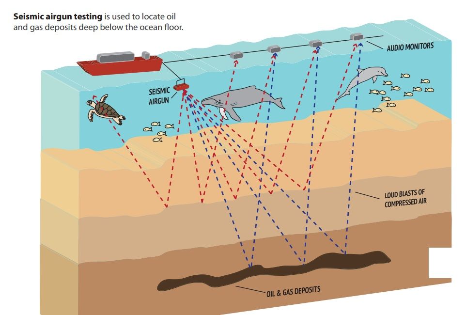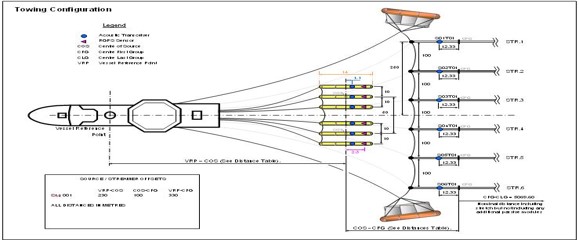 如圖一艘地震船,后面拖著槍陣(用于激發空氣波),以及纜繩(檢波器被封裝在纜繩中,用于接受地震波),多纜船覆蓋面積可以達到幾公里寬,十多公里長。然后就像刷油漆一樣,將需要作業的工區覆蓋完整。