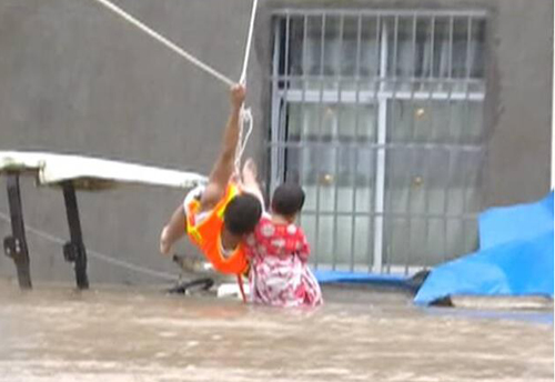 6月30日以來,中國湖北、安徽、江蘇、貴州等26個省市連續遭遇強降雨。截至7月3日統計,全國已有26省(區、市)1192縣遭受洪澇災害,受災人口3282萬人,緊急轉移148萬人,因災死亡186人、失蹤45人。7月1日,由于持續的降雨引發的山洪讓湖北省大悟縣陽平鎮新寨村付家6名群眾被困。由于當天警情多,已沒有多余救生拋投器等救援設備,大悟消防大隊現場指揮員在居民樓中間利用救援繩架設空中通道,營救被困人員。其中消防戰士劉曉鵬在繩索上往返12次,救出6名被困群眾。